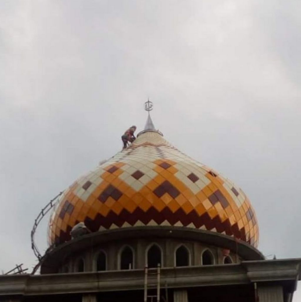 “Alhamdulillah hasil kubahnya sangat memuaskan. Warnanya berkilau, desainnya sesuai gambar, dan terlihat megah sekali dari jalan raya. Jamaah banyak yang kagum!”